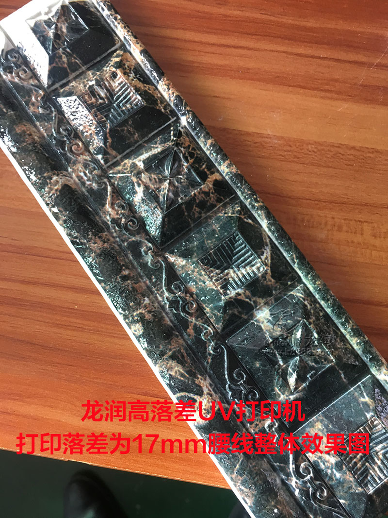 我們隨機(jī)抽取了一塊樣品進(jìn)行打印,打印出來(lái)后整體效果還算滿(mǎn)意,客戶(hù)也能認(rèn)可,然而我們那尺子測(cè)量該腰線(xiàn)的落差高度,才知道該腰線(xiàn)落差高度已經(jīng)達(dá)到了17mm,比我們之前測(cè)試的15mm樣品還要高2mm,然而看細(xì)節(jié),發(fā)虛并不嚴(yán)重,也沒(méi)有嚴(yán)重飛墨的情況出現(xiàn),整體效果已經(jīng)是能達(dá)到客戶(hù)的需求。